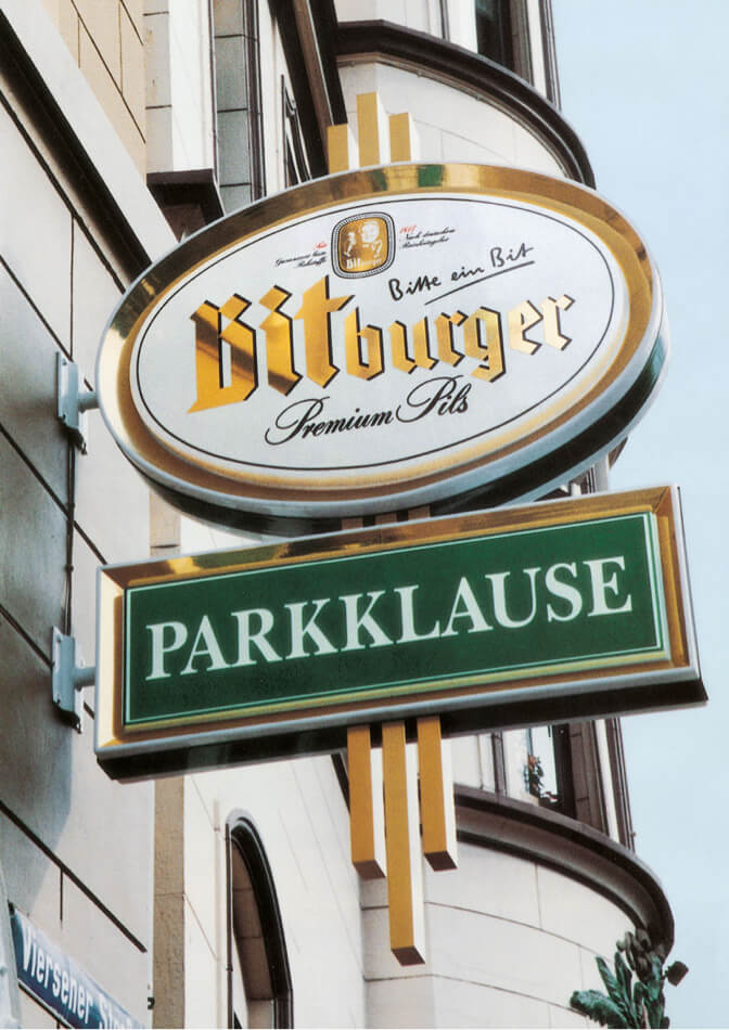 With a new outdoor advertising Bitburger creates a uniform appearance in the gastronomy. In the same year, the brewery supported the Benetton Formula 1 team with Michael Schumacher.