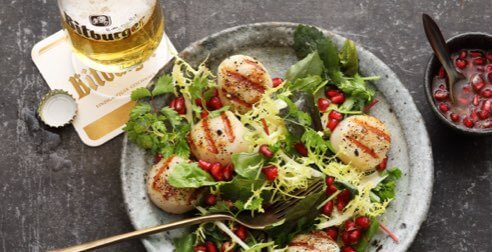 - Grease the grill rack with oil and grill the scallops for 2 - 3 minutes on each side. Then season with salt and pepper and pass 4 - 5 mussels to the salad.