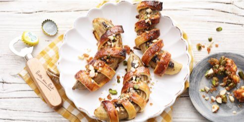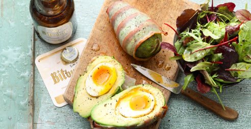 - Cut the avocados in half and remove the stone and the skin. Hollow out the holes left by the stone with a spoon so that they can be filled with the eggs. Put the other half on top and wrap 4 slices of bacon around.