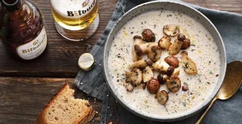 - Heat the butter in a large saucepan and brown the mushrooms for a few minutes. Season with salt and pepper and remove a third of the mushrooms from the pan. Set aside. Add the diced shallots, garlic and herbs, brown briefly, then deglaze the bottom of the pan with the bier. Add the sherry and the stock and allow to bubble gently for 12 to 15 minutes.